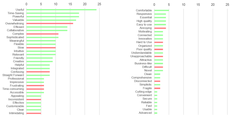 プロダクトリアクションカードの回答結果をディスプレイするもう1つの良い方法は、選択された単語と頻度を示すシンプルなグラフを作成することです。グラフ上のネガティブな単語部分をハイライトするとそのプロダクトの弱みや改善領域がひと目で分かります。
