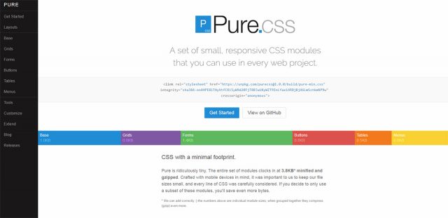 グリッドのような容量の小さなライブラリサンプルを使用したい場合も、個別にダウンロードすることができます。 Pureのグリッドセクションサイズの合計は約0.8KBで、BootstrapやFoundationに比べてはるかに軽量です。