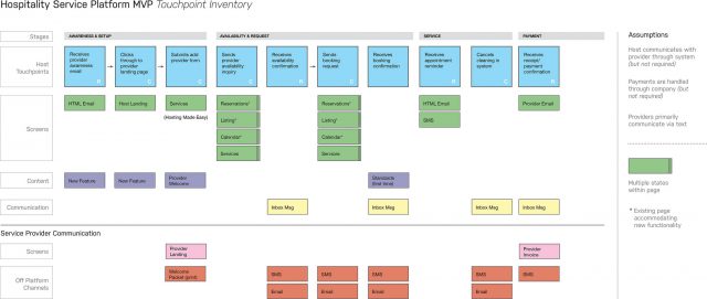 下図は、別のリーンなアプローチを表したものです。この図は、新しいタッチポイントと既存のタッチポイントをどのように繋げるのかというビジョンを示すものです。それぞれのモーメントに対して、必要な画面やコンテンツ、伝達方法などの仕様が含まれています。これは、異なるチャネルを担当するチームのデザインプロセスにも使えるでしょう。