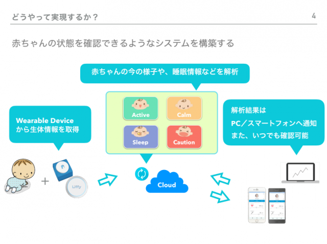 具体的には「Liffy」では、両親が赤ちゃんをずっと見ていなくてもアプリを使って状態を把握できるサービスになっています。赤ちゃんにリストバンドのような形のウェアラブルデバイスをつけて生体反応を採り、そこから今の状態を分類してアプリ表示させる形です。