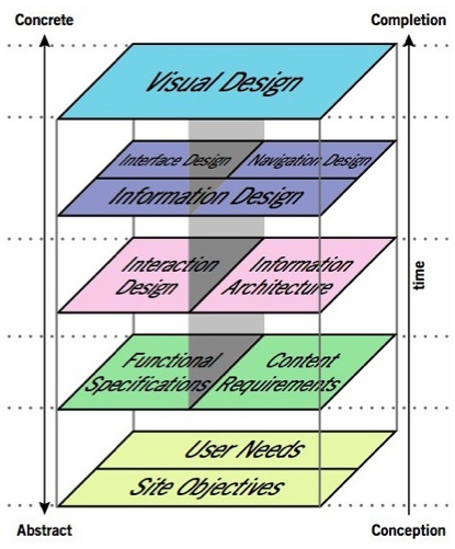 Jesse James Garrett氏による「UXの要素」という構造は、2000年に誕生したにもかかわらず、未だにUXの原則を伝えたり広めたりするのに有効です。彼のわかりやすく簡潔なイラストによれば、UXはいくつかの階層をもち、概念の段階から完成の段階、あるいは抽象の段階から具体の段階に分かれています。