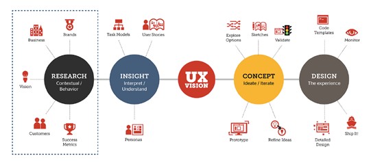 この基準を説明するのにもっとも適したツールはおそらく下の図です。この図はUXのプロセスを簡潔に表しており、さらに、ユーザー中心のデザインを制作する際に重要な6つの原則も示しています。