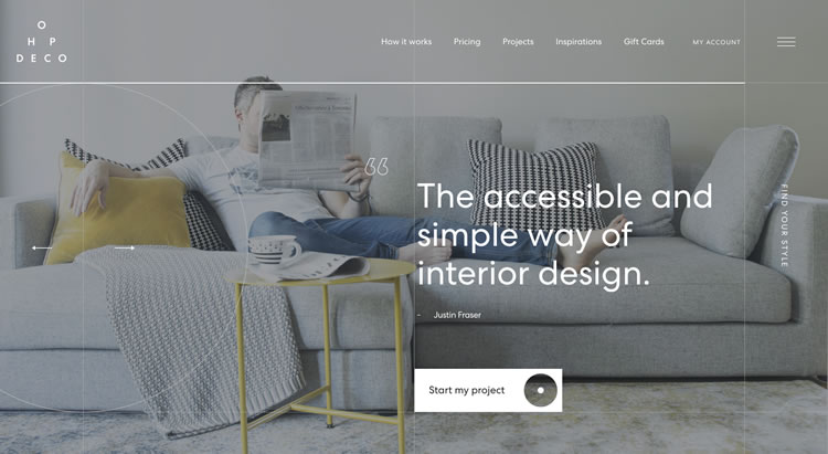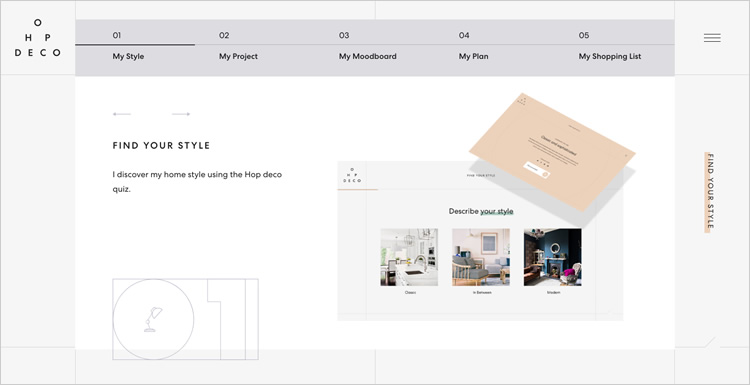 もしユーザーがほんの少ししかスクロールしないのにナビゲーションバー全体が下に降りていく事に対し、煩わしさを感じるのではないかと心配であれば、次のことを覚えておいてください。固定ナビゲーションバーは全体の一部だけに適用し、残りはトップにそのまま置いておくということです。HopDecoの例を見てください。