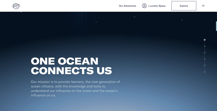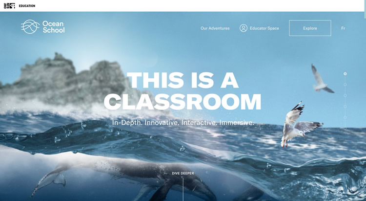 この比較的まばらなナビゲーションバーは、少ししかオプションを置かないことで、固定ナビゲーションバーの候補になり得ます。しかし、Ocean Schoolのウェブサイトは大変カラフルで、何色かの異なる青、緑、そして紫色が映っています。