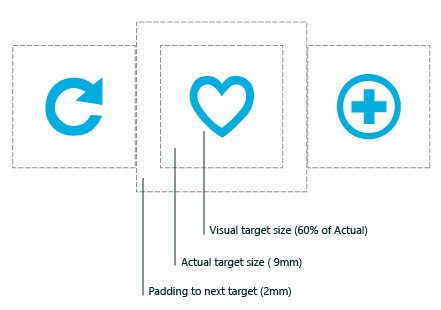 アイコンはユーザーにとって押しやすくあるべきです。 携帯電話のスペースのためにアイコンをあまりにも小さくすることは、デザイナーの間でも起きやすい間違いの1つです。 タッチ用にデザインするときは、アイコンが指で触れやすい大きさであることを確認してください。 タッチスクリーンオブジェクトの推奨サイズは7〜10 mmです。 また間違ったタップを防ぐために、ターゲット間に必ずパディングを追加してください。