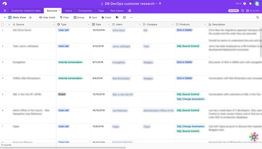 電話調査やユーザビリティテストなどで得られたカスタマーリサーチの詳細を、Airtableに記録します。このとき、リサーチノートなどのカスタマーリサーチの生データへのリンクも合わせて書きましょう。Airtableの表には実施したリサーチの記録と、関わった顧客の記録を載せてください。