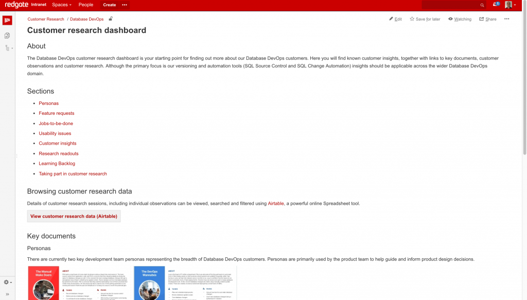 Confluenceは、簡単にWikiを操作して高度なインサイトやそのアイデアを提示するため、または顧客とのインタビューのメモといった生データを貯めておくために使用します(OneDriveやGoogle Driveも顧客調査の生データを貯蔵するのに使用できます)。 ConfluenceやSharePointといったWikiにアクセスできないなら、WordPress.comなどのサービスを使用して簡単なWebサイトを構築して活用すると良いでしょう。