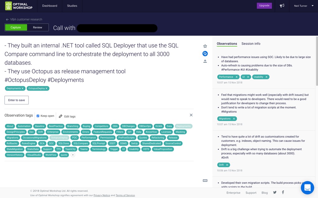 JTBTやペルソナ、対処すべきユーザビリティの問題などの高度なインサイトを、観察結果に紐づけアップデートします。可能であれば高度なレベルのインサイトから、その元となった電話調査のメモなどのカスタマーリサーチを参照できるようにしましょう。