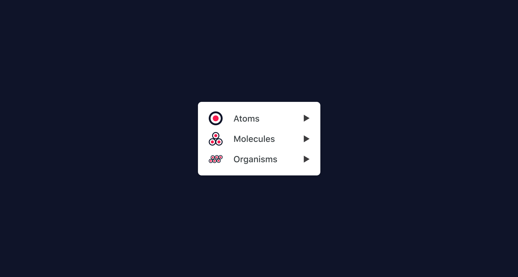 - 分子(Molecules):ユニットとして共に機能する原子のグループを表します。分子は実体のあるUI要素です。たとえば、ボタンとテキストフィールドが一緒になった分子は、検索フォームを構成します。