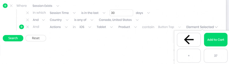 ゲームアプリなら、先週アプリにログインしたすべてのユーザーや、前月に次のレベルに進むために100ドル以上払ったすべてのユーザーにクエリを実行できます。また、小売業界のアプリでは、過去30日間にiOS デバイスを使って商品をカートに入れたアメリカとカナダのユーザーのセッションをふるい分けることもできます。このようなセッションに関する部分の記録を調査することで、ユーザーの行動パターンを特定したり、UXの改善点を発見したりするのがこれまでになく簡単になりました。