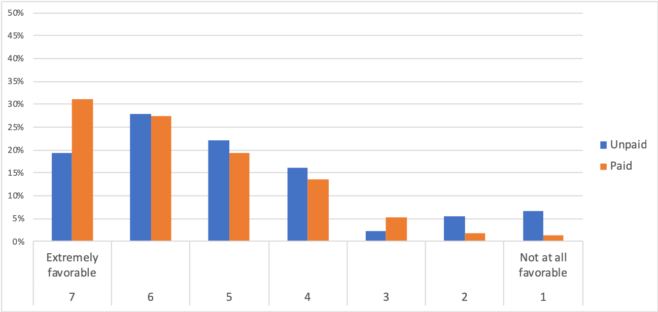 感情のスコアの分布は図2に示しています。どちらも肯定的なバイアスが視認できますが、有償の参加者と無償の参加者の分布には違いがあります。無償の参加者と比較すると、明らかに有償の参加者のほうがもっとも好意的な7(最上位)のスコアを選んでいます(31% vs 19%)。また否定的な反応については、有償の参加者(8%がスコア3以下)よりも無償の参加者(14%がスコア3以下)のほうが多くなっています。