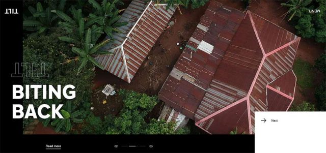 Tilt Storyの例を見てみましょう。このプロジェクトチームはソリッドとホローの組み合わせを使って、まさにそれを表現しています。プロジェクトネームを強調しながら、企業名のロゴもかっこよく今どきに表現しています。ここで最初に読むものは「BITING BACK」でしょう。しかしすぐ次に、逆さ文字になっているロゴ「TILT」が目に入ってきます。