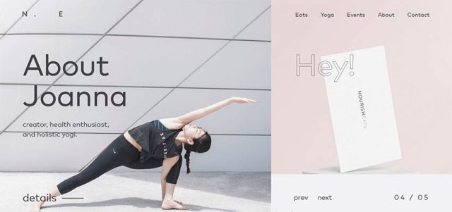 NourishEatsについて考えてみましょう。フロントページには左右非対称の縦に分割したスクリーンを使用し、右側よりも左側に重点を置いています。これはいくつかの点から読みとることができます。セクションのサイズはもちろんのこと、文字のスタイルからもそれを明確にさせています。繊細で軽い「Hey」よりも、「About Joanna」は、しっかりして大胆な印象を与えます。