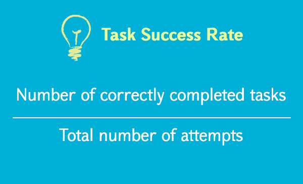 タスクの達成率とも呼ばれるこの指標は、ユーザーが正しくタスクを達成した割合を示すパーセンテージです。ユーザーが特定のタスクをどれほど効率的に達成できているかを反映するパフォーマンスの指標の中では、恐らくもっとも頻繁に使われています。登録フォームの入力やプロダクトの購入といった、明確に定義された目標や到達点があるタスクであれば、成功率を計測することができます。データを集める前に、何をもって成功とするのかを定義しておくことが重要です。