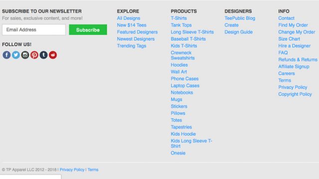 ここで避けなければならないのが、TeePublicのフッターのように、プロダクトのカタログすべてを詰めこむことです。