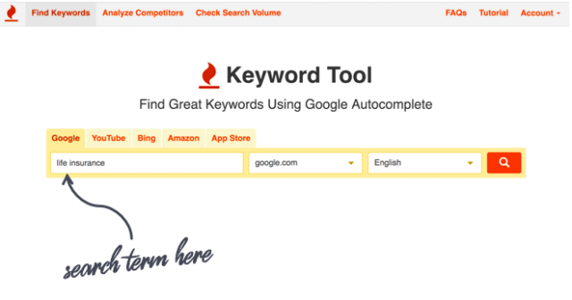 この調査では、ロングテールキーワードのデータを入手するために、キーワード検索ツールが必要になります。Moz Keyword Explorer やUbersuggestといった素晴らしいツールがたくさんありますが、中でも私はKeywordtool.io.を好んでいます。ただ、検索ボリュームのデータにアクセスするには有料版にアップグレードする必要があります(このあと説明しますが、検索ボリュームはとても重要です)。