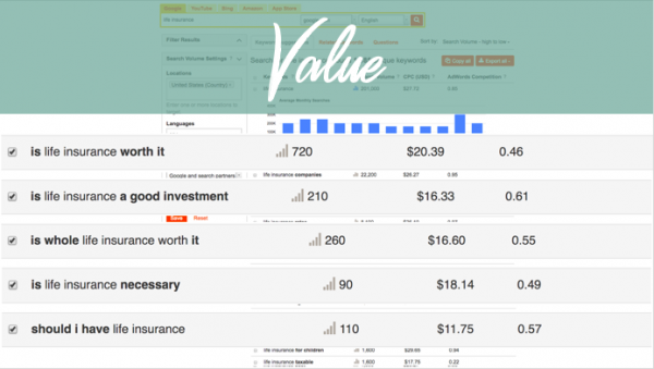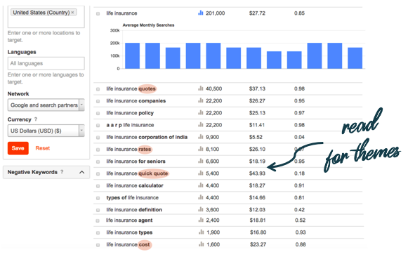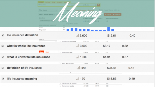 今回の例では、キーワードツールは、「生命保険」を含む約1,200個のロングテールキーワードを生成しました。とても素晴らしい結果です。ここでの目的はキーワードリストを見通して、「生命保険」というカテゴリーに共通する検索意図の話題を特定することです。