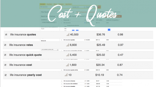 以下の例では、ユーザーがコストや見積もり、レートに関する情報を探していることがわかります。生命保険を判断する際にもっとも重要になる情報であるため、理に適っています。
