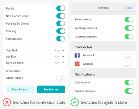 トグルスイッチを文脈上の状態のために使うという間違いを犯しているアプリがたくさんあります。よくある間違いは検索フィルターにスイッチを使う例です。フィルターは検索の環境だけに使われるもので、システム全体に対してではありません。ですから、選択操作に適切なコントロールはチェックボックスであり、スイッチではありません。