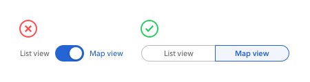 対立する選択をするときにはトグルボタンが適切なコントロール部品です。上のサンプルでは、「リスト表示」と「マップ表示」がユーザーがトグルする対立的選択です。このような状況ではトグルボタンがスイッチよりも有効です。なぜなら選択肢がひとまとまりになっていてユーザーが一度に見ることができるからです。また、ユーザーは目で確認しながら選択肢をダイレクトに選ぶことができます。
