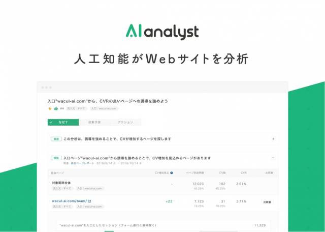 垣内:株式会社WACULは「テクノロジーで、ビジネスの相棒を一人一人に」をビジョンに掲げ、中小企業を中心にこれまでデータドリブンなマーケティングができなかったみなさんのビジネスの相棒として、課題を解決していこうとしている会社です。当社の主なプロダクトである「AIアナリスト」は、人工知能がアクセス解析データを中心としたビッグデータの分析を行い、そこから改善提案を行うSaaSツールです。2019年5月時点で28,000サイト以上に導入されています。