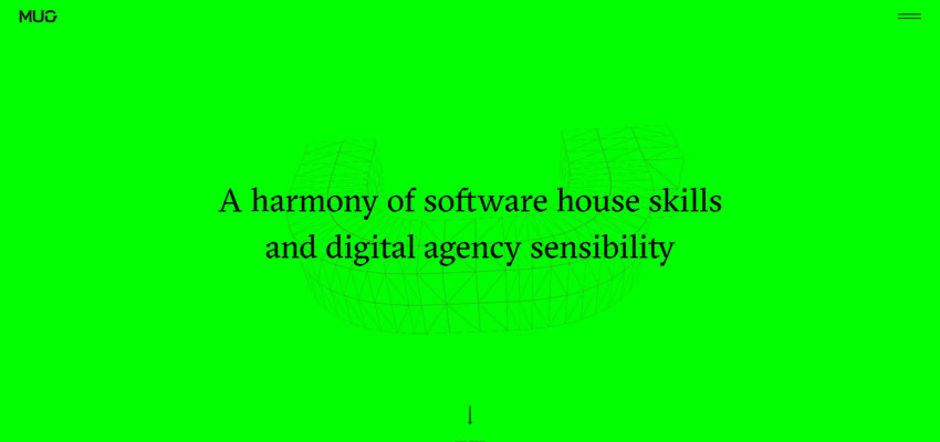 MUGでは、最低限のヒーローエリアにメニューやロゴ、キャッチコピーといった重要なものだけが配置されています。しかし、決して稚拙ではありません。背景にはMUGの名前を想起させる大きな「U」の文字がアニメーションで表示され、興味を引くものとなっています。