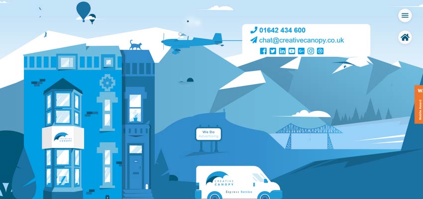 こちらはまた別のブルーを基調としたサイトですが、さきほどの例よりももっと複雑で入り組んでいます。Creative Canopy はそのWebサイトの美しさが、モノトーンデザインによってつくりあげられている非常に素晴らしい例です。さまざまな濃淡のブルーが使われ、絵に深みと多様性を与えています。そこに退屈さは微塵もなく、賢いアイディアと素晴らしい技法が人々の興味を引きつけてやみません。さらに、ホームページ全体でも同じアプローチが使われており、ユーザー体験の一貫性を生み出しています。