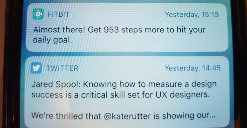 Fitbitは、1時間毎に目標歩数を歩くよう促す通知や、1日の目標歩数に到達しそうなときに達成を促す通知など、短い通知を送りユーザーを促します。