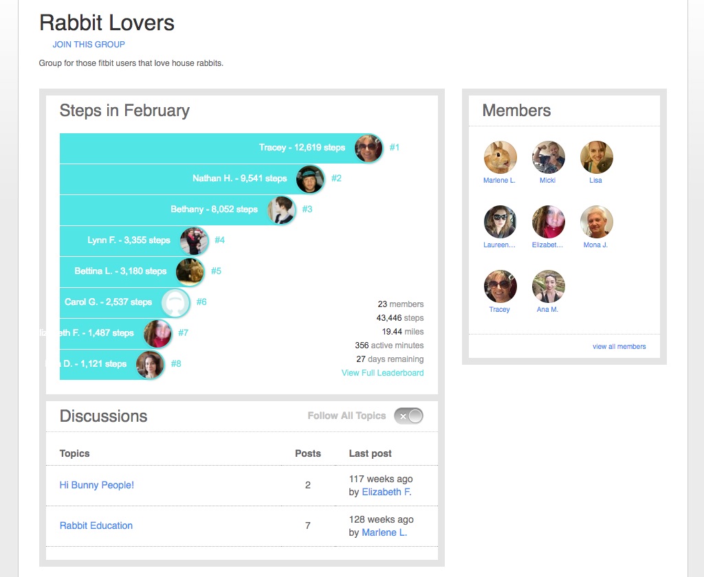 Fitbitは、友達、家族などのグループ内で競い合う機能があり、たとえば、1か月で一番多く歩いた人、仮想トレイル上で最初に目的地へ到達できた人などが表示されます。そして、ユーザーはほかの人と記録を比較してリーダーボードの順位争いができます。