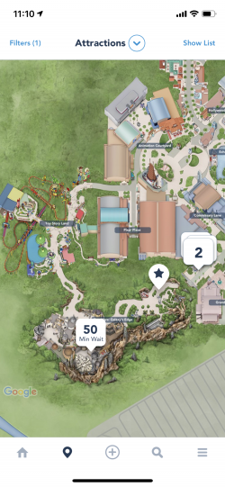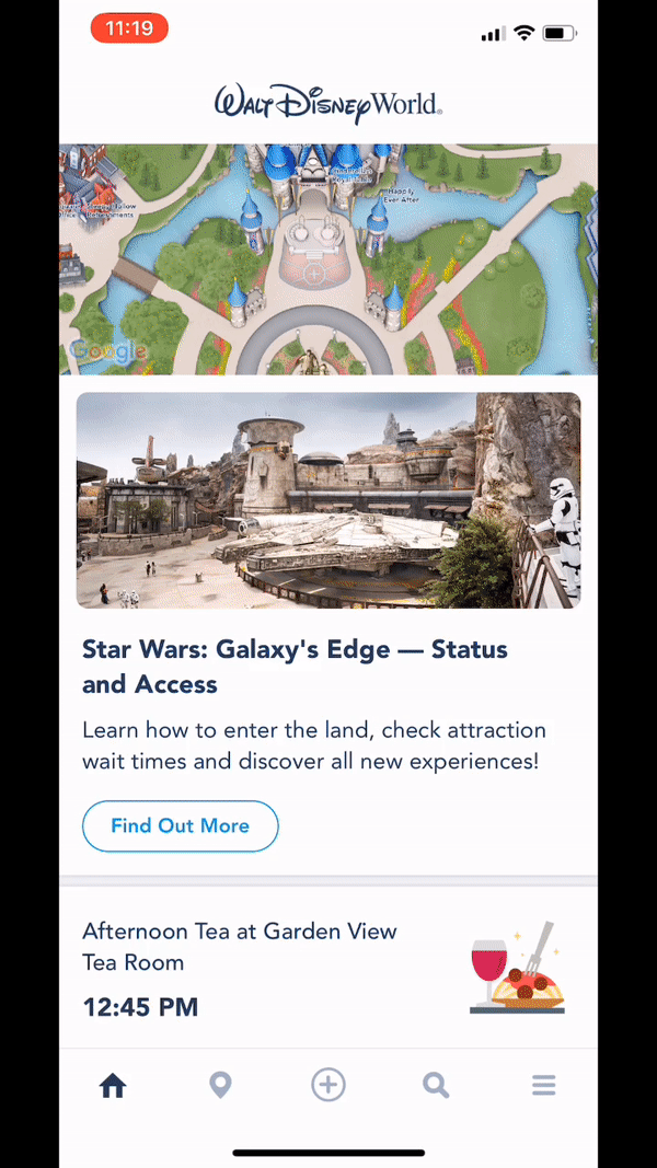 私は前述の「ギャラクシーズエッジ」が新しくオープンするタイミングの週末に来園しました。アプリのホーム画面には大きな吹き出しが表示され、詳細や待ち時間などが表示されていました。これは一か所にまとまっていると便利な情報でしたが、パフォーマンスのバグがありました。待ち時間はパーク内のこの特定のエリアでの1つ乗り物のみを示しており、すべての乗り物の待ち時間を確認するためには、アプリを強制終了して再起動をする必要がありました。
