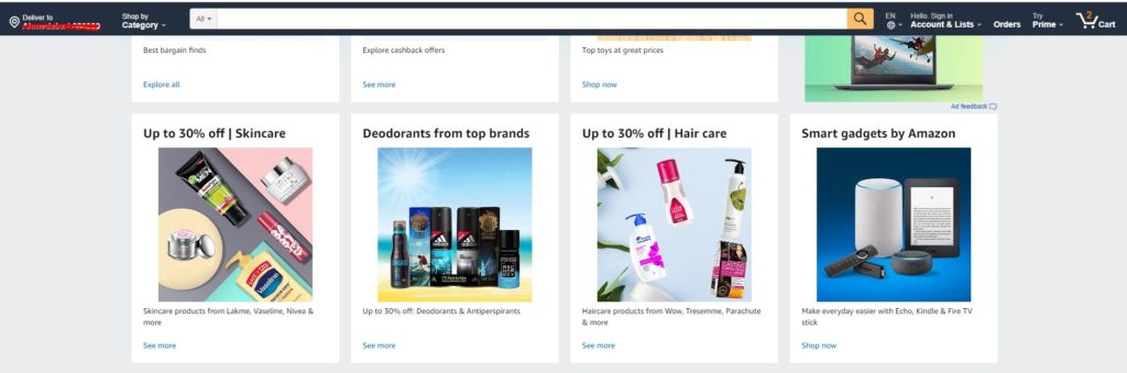 上記の画像からわかるように、「カテゴリ別に購入」の選択を使用して商品を検索する選択肢があるにもかかわらず、Amazonは検索バーに重点を置いてユーザーが探しているものをほぼ瞬時に見つけられるようにしています。