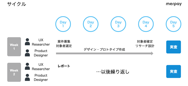 もう少し詳しくサイクルをご説明していきます。以下のように1日目にUXリサーチャーが案件を募集し、対象者の選定から確定までのリクルーティング全般、リサーチの設計を行います。その傍らでデザイナーはプロトタイプの作成をし、5日目にリサーチ当日を迎えます。