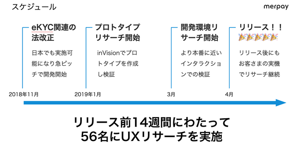 リリースまでのスケジュールとしてまず2018年11月にeKYC関連の法改正があり、日本でも実施可能になりました。そこから急いで検討を進め、2019年1月からプロトタイプを作成し、リサーチを開始しました。2019年3月から開発環境でのユーザビリティテストを毎週積み重ね、無事2019年4月にリリースすることができました。