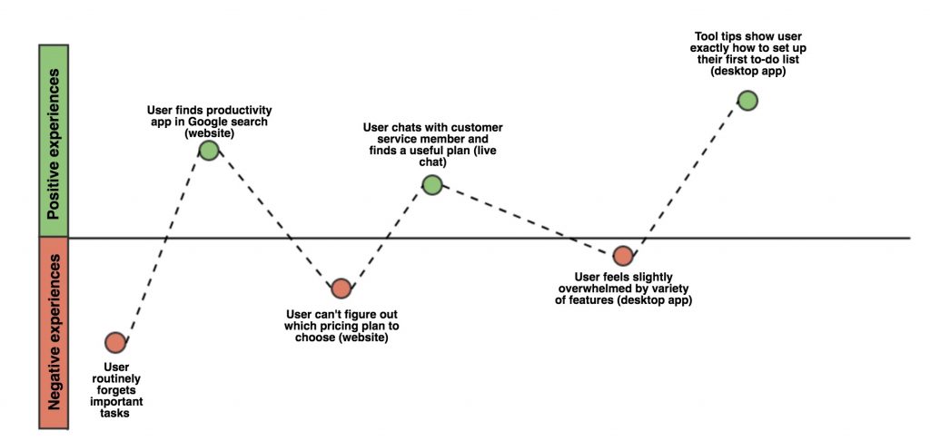 以下のマップは、肯定的な感情と否定的な感情の程度や、重要なステップが相対的にどれだけ簡単なのかすぐに把握することができます。