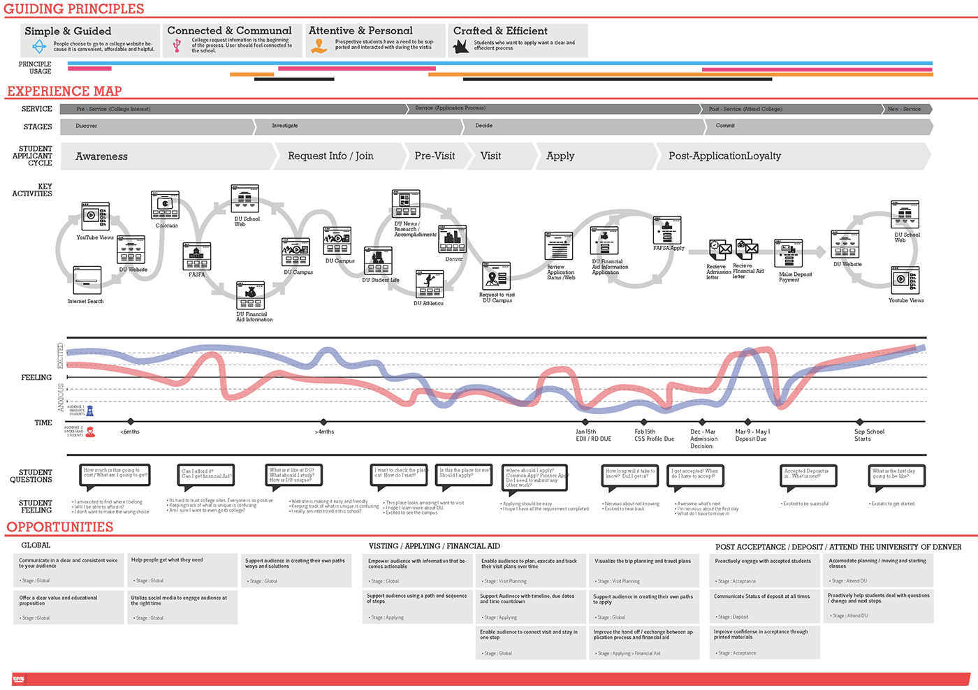 複雑な事例として、以下の大学の体験マップのようなユーザージャーニーは、情報の階層がいくつにも分かれています。ただし、このようなマップのユーザビリティは非常に低くいです。マップを見た人は提示された情報を理解するために非常に努力しなければならず、プロセスを改善する際の障害や機会を特定するために分析し続けなければなりません。