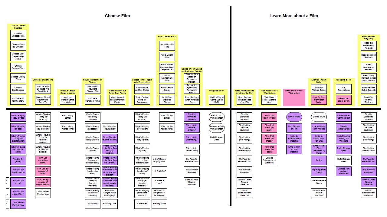 ユーザーのメンタルモデルを詳細にまとめられるように、以下のようなメンタルモデルのマップが使えます。メンタルモデルのマップは、見たい映画を選ぶようなタスクを達成するときにユーザーが実行するステップ、考慮事項、思考プロセスをまとめたものです。 メンタルモデルに関するIndi Young氏の著作にはメンタルモデルのマップを作り、活用するための情報がたくさん乗せられています。
