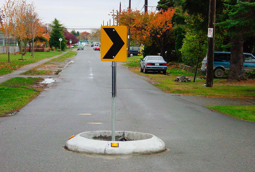 このようにメンタルモデルが矛盾しているのは、今回の小さな環状交差点や、無数の同じような環状交差点のデザインが悪いことに原因があります。瞬間的に環状交差点とも合流地点とも解釈できるため、デザインを見てもユーザーが適切なメンタルモデル(たとえば環状交差点のメンタルモデル)を判断できません。車両が小さな環状交差点を踏まないようにするためにも、小さくても環状交差点であることは変わらないと強調するためにも、以下の写真のように、標識や縁石を用いて環状交差点であることが明白なデザインにするべきでしょう。