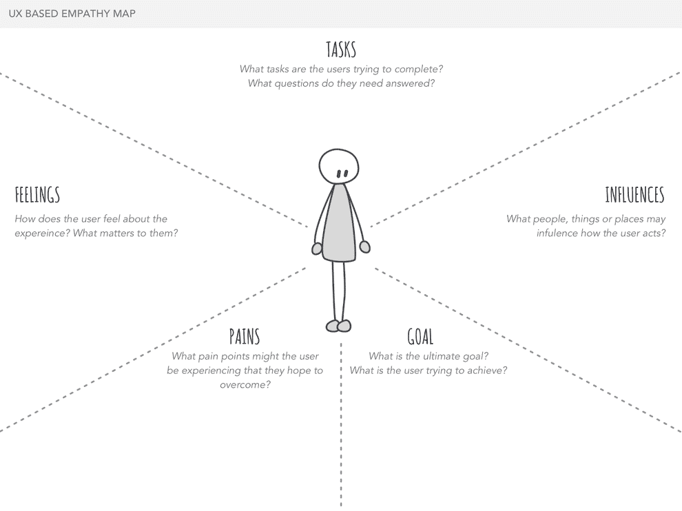 共感マップは、ある特定のタイプのユーザーについて私たちが知っていることすべてを表現できるようにつくられています。ユーザーのニーズ、目的、期待、それからペインポイントを理解することで、体験のあらゆる段階において私たちがサポートしやすくなりますし、デザインにおいて賢明な判断を下すことができるようになります。