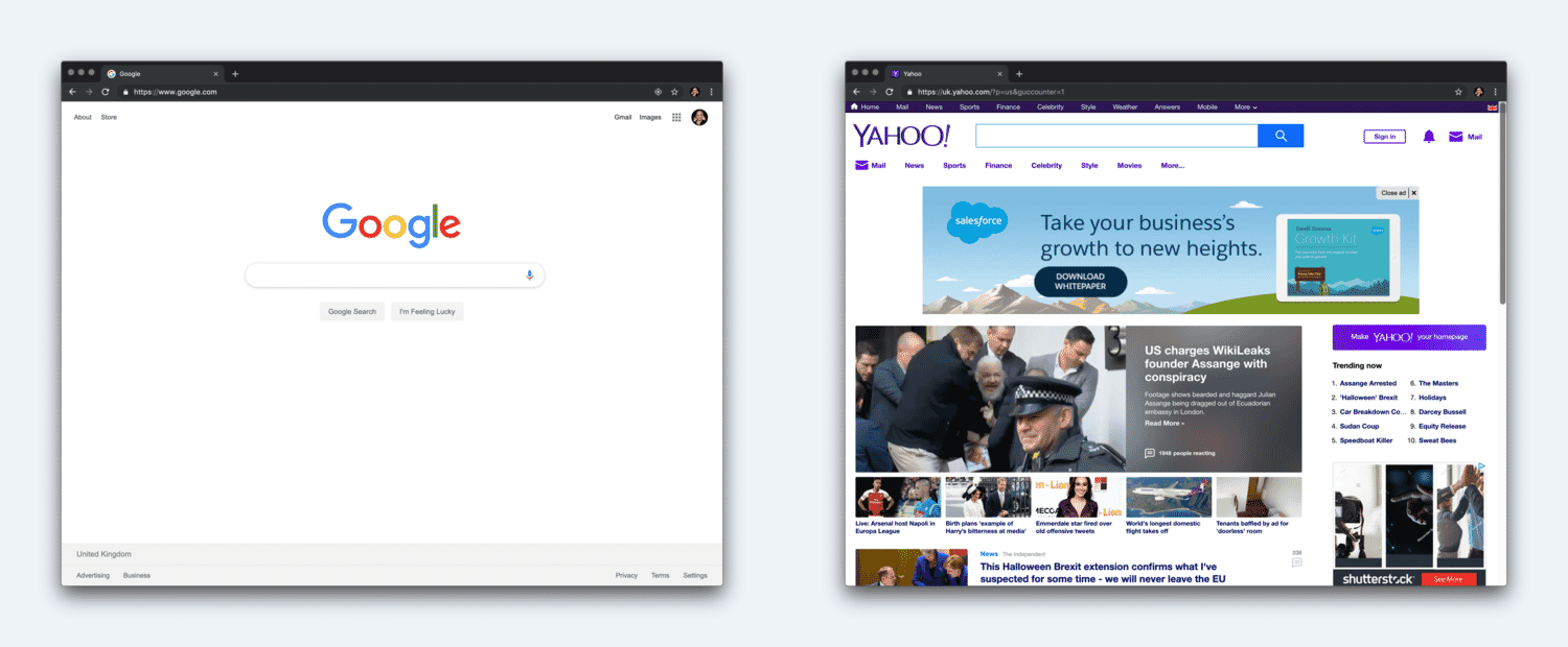 5. 次に、GoogleとYahooのページを開いて、並べて表示します。そして参加者に、どちらがうまく行っているか聞いてみましょう。ほとんどの人がGoogleだと答えるはずです。