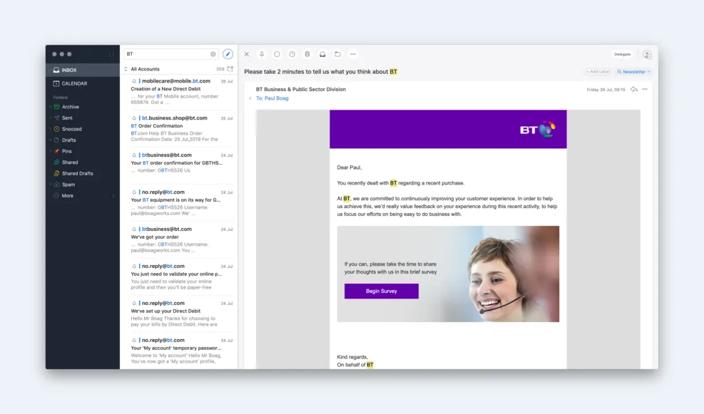 BTのさまざまな部署から数日で数十通のメールを受信しました。