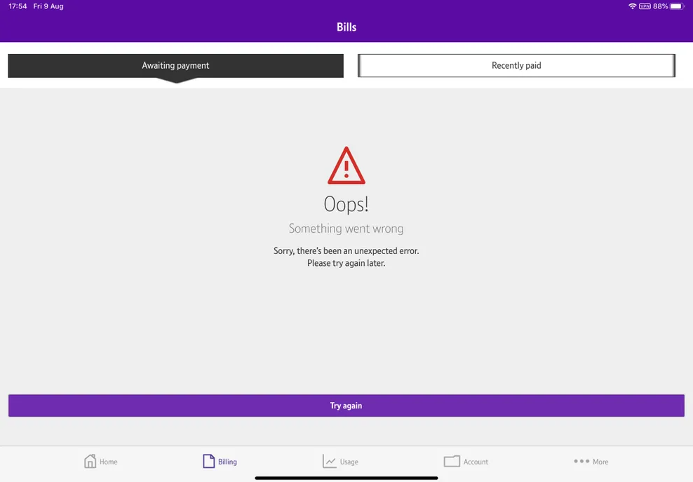 iPad上のBT Businessアプリにエラーが出ているところ。BT Businessはまったく使えず、サポートを提供する仕組みが整っていませんでした。