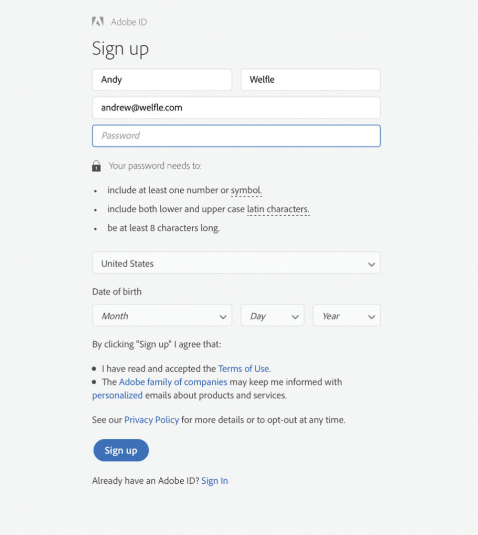 行動を起こすのに不可欠な情報(パスワード設定ルールや、先に進む前に使用条件に同意すること)は、テキストフィールドやアクションボタンの前に置きます。たとえツールチップや「情報」のボタンに隠れているとしても、ユーザーが決定を下すポイントに辿りつく前に表示される必要があります。