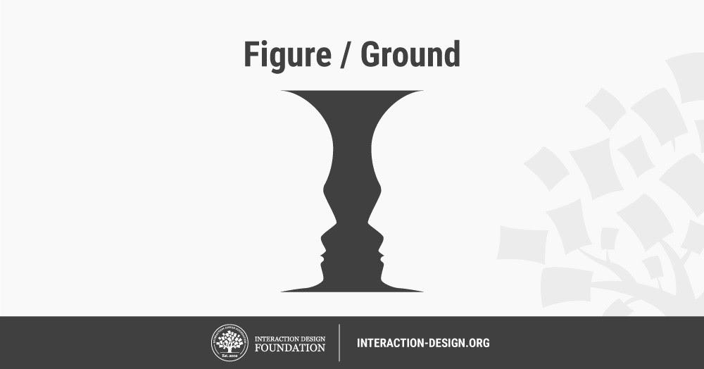 上の有名な画像をみたとき、壺のイメージを認識しながらも、人の脳は自然に2つのスペースを2つの顔にグルーピングします。これがゲシュタルト原則のよい例です。