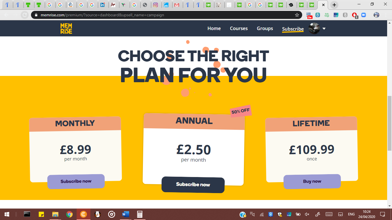 ここではユーザーにプレミアムプランを売り込むことで悪名高いMemriseを紹介します。この画像では、Annual(年間)プランを他より大きくし、「Subscribe now(いま登録する)」ボタンを他と違う色とすることで差別化したうえで、小さく50%オフのタグを設置してAnnualプランが最適のプランであると強調しています。