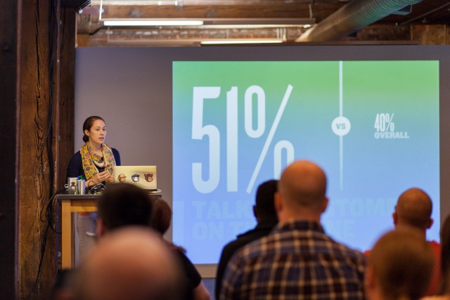 MailChimpでは毎週金曜日の朝に、会社全体のコーヒーアワー (懇親会) を開催しています。通常は外部からゲストをお招きして、テクノロジーや業界の動向、創造性などについてプレゼンテーションを行ってもらいますが、年に数回UXリサーチチームも機会を設けていただき、会社全体に向けて数か月間の調査報告の概要を説明しています。先にご紹介したドキュメンタリー動画やユーザビリティ・ランチが個人のユーザーや特定の企業に焦点を当てているのに対して、コーヒーアワー ではアプリの利用やクライアントの行動に関する全体的な動向やパターンに注目し、リサーチ結果の全体像を共有しています。
