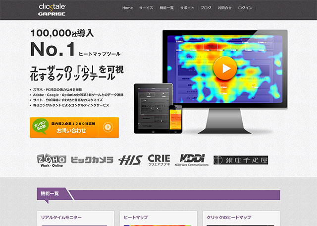 国産のヒートマップ分析ツールで、UserHeatの機能を強化した有料版です。早稲田大学大学院での研究をもとに開発が行われました。官公庁など、国内の組織・企業など幅広く採用されています。