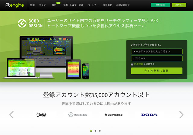Ptmind社がリリースしているヒートマップ分析ツールです。登録アカウントは35,000以上で、ヒートマップ分析サービスとしては大手になります。メルセデスベンツやコンバース、Huaweiなど、グローバルな企業にも利用されています。