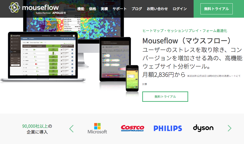 Mouseflowは欧米でシェアを拡大しているヒートマップ解析ツールです。全国で90,000社以上の企業に導入されており、有料ではあるものの、業界水準で低価格なのが特徴です。