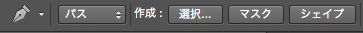 しかし作業用パスそのものは、色面や線幅を持たないため、レイヤーパネルには表示されません。ペンツールを選んだ状態でパスを選択していると、Photoshop作業パネル上部にあるメニューから、作業用パスがシェイプや選択範囲、マスクなどに変換できます。