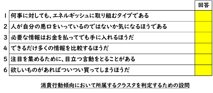 インタビュー対象の候補者には、インタビューの協力を依頼する際に「消費行動傾向モデル」の所属クラスタを判定するための6つの設問に対する回答を得ておきます。